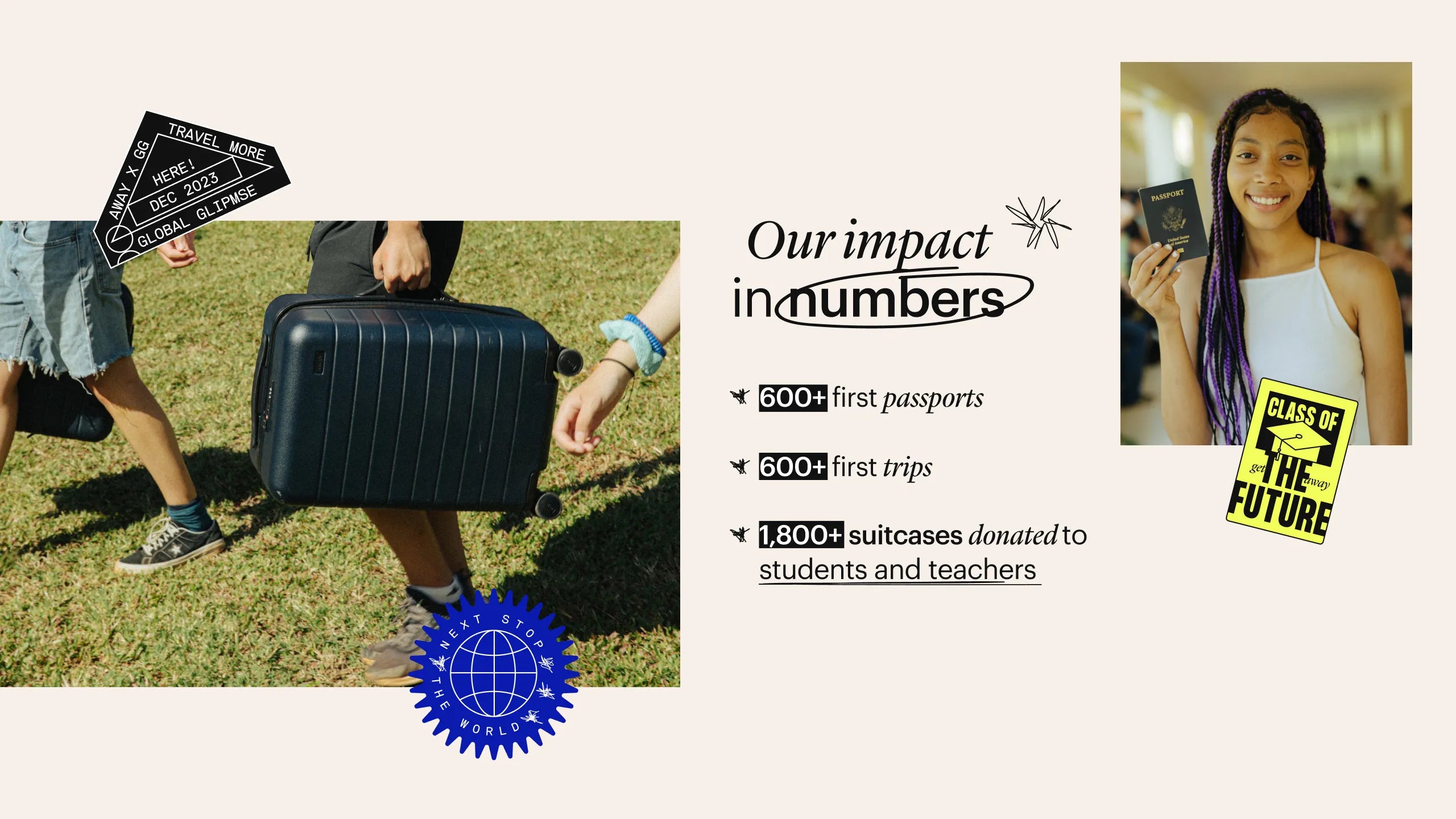 Together, we launched Global Glimpse’s Passport Scholarship Fund to remove the financial barrier for students getting their first passport. In 2022 and 2023, Away will cover the cost of passports for every student in need of one