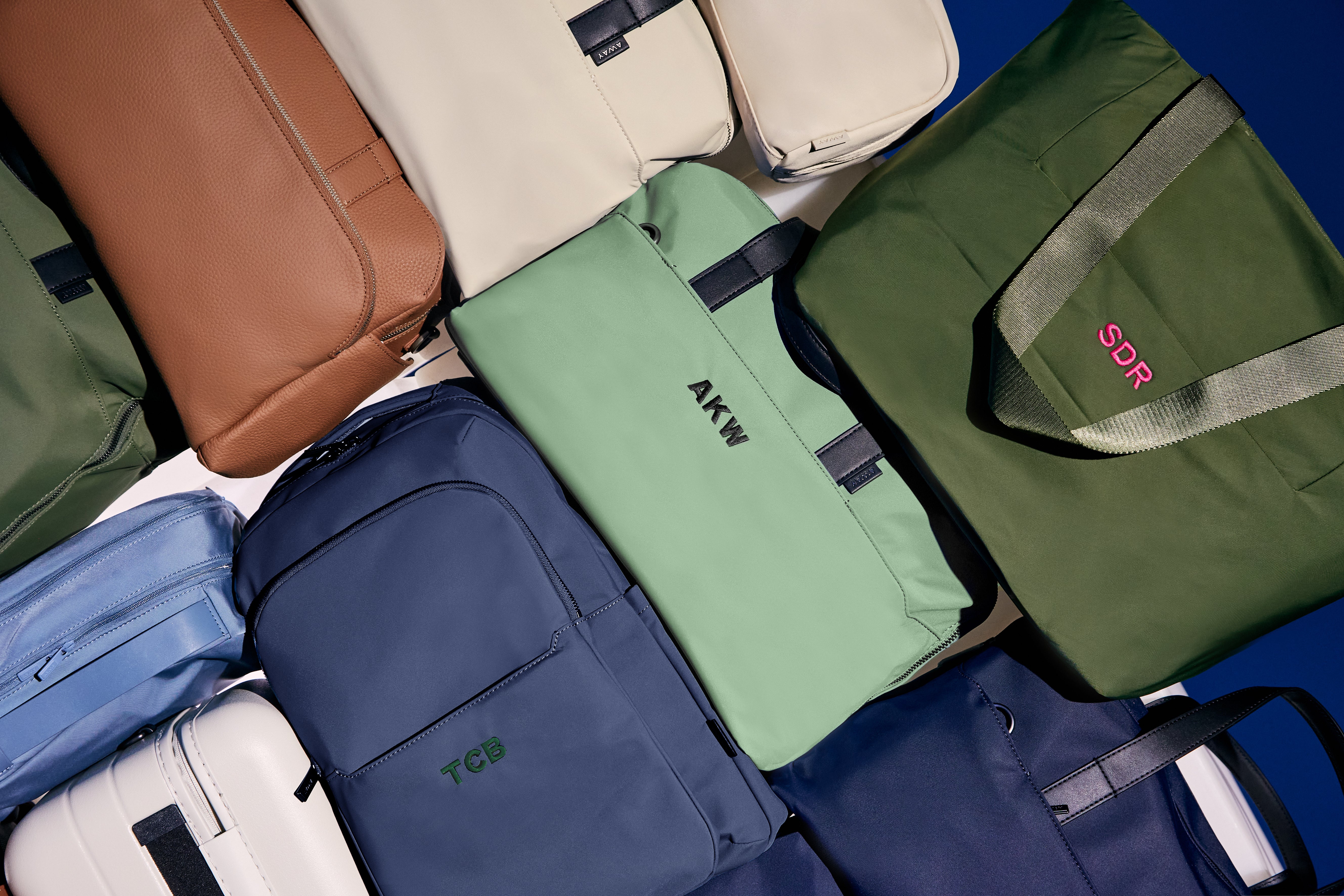 A green Away duffle with three letters embroidered on the back