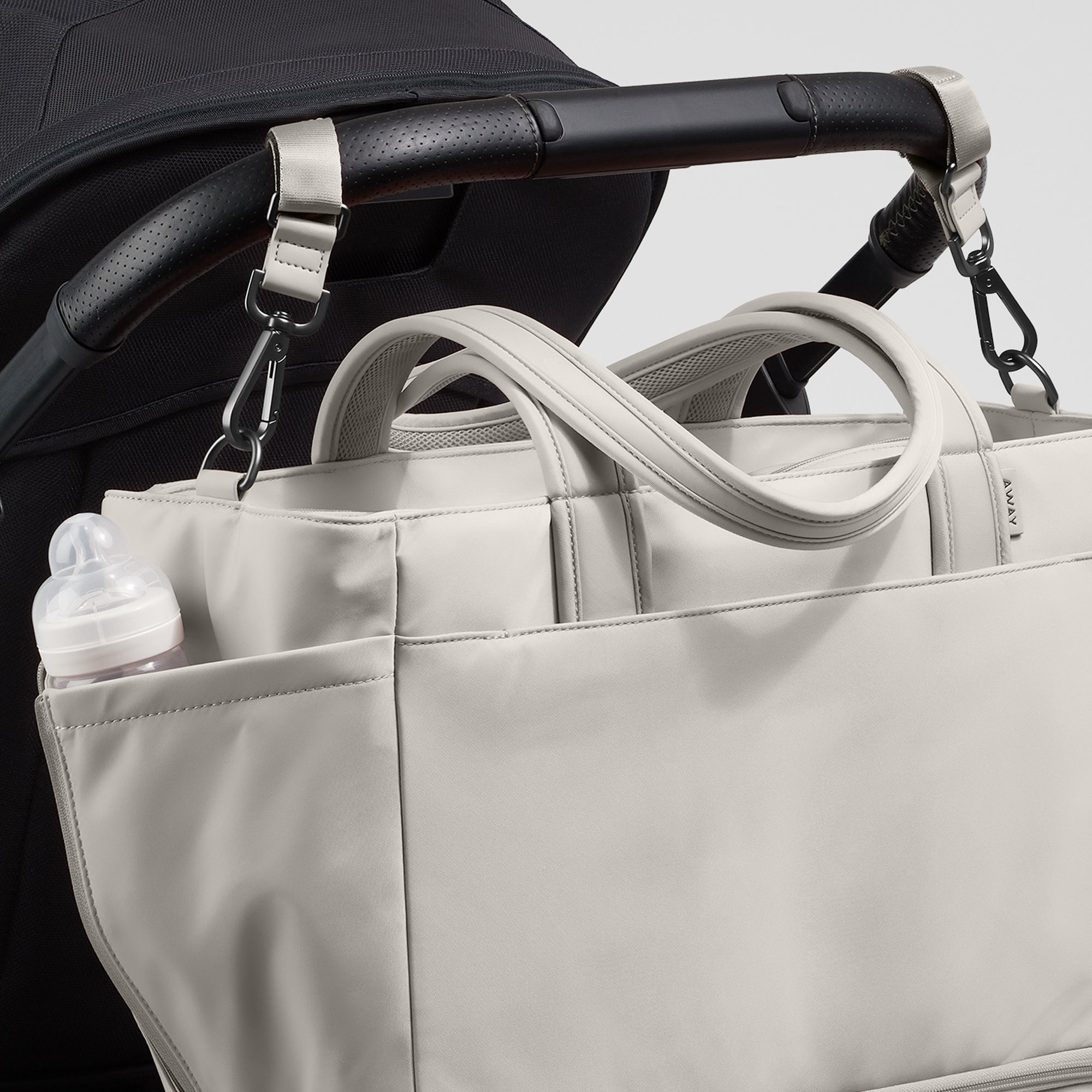 The Double Diaper Tote attaches to all our suitcases. Just slide the trolley sleeve over the suitcase handle and you’re ready to roll.