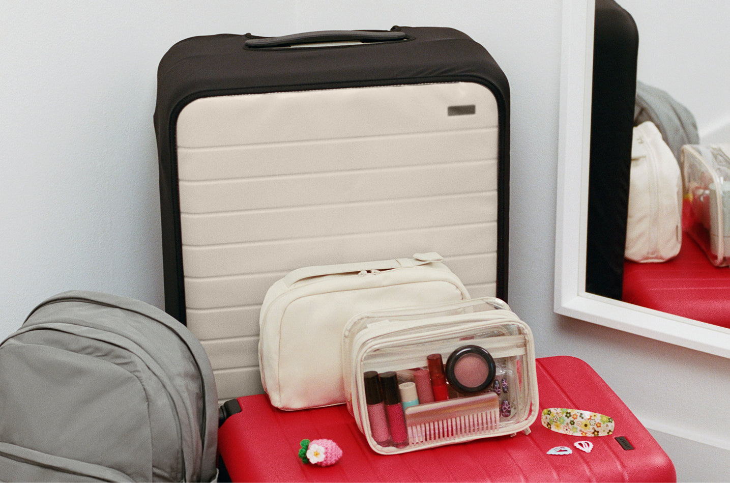 Our bags attach to your suitcase so you can stack, roll, and keep essentials close. One smooth system that makes every trip feel a little more put together.